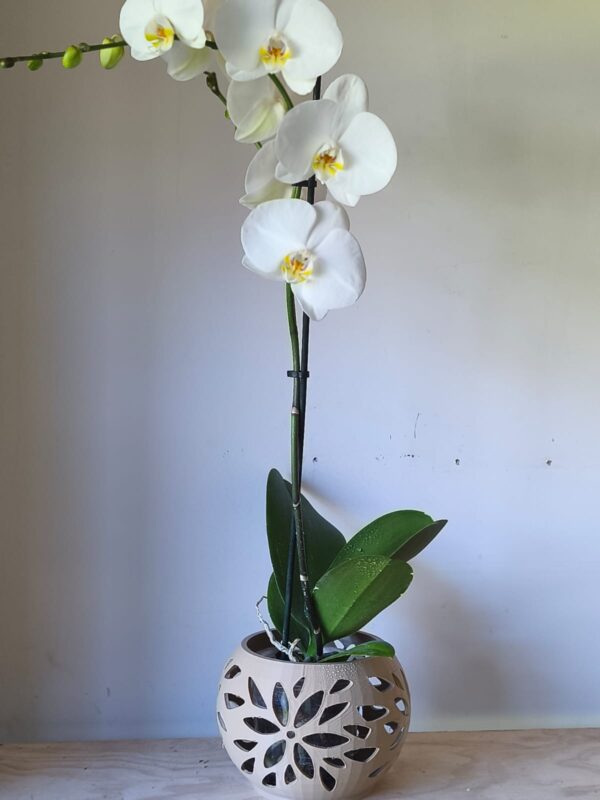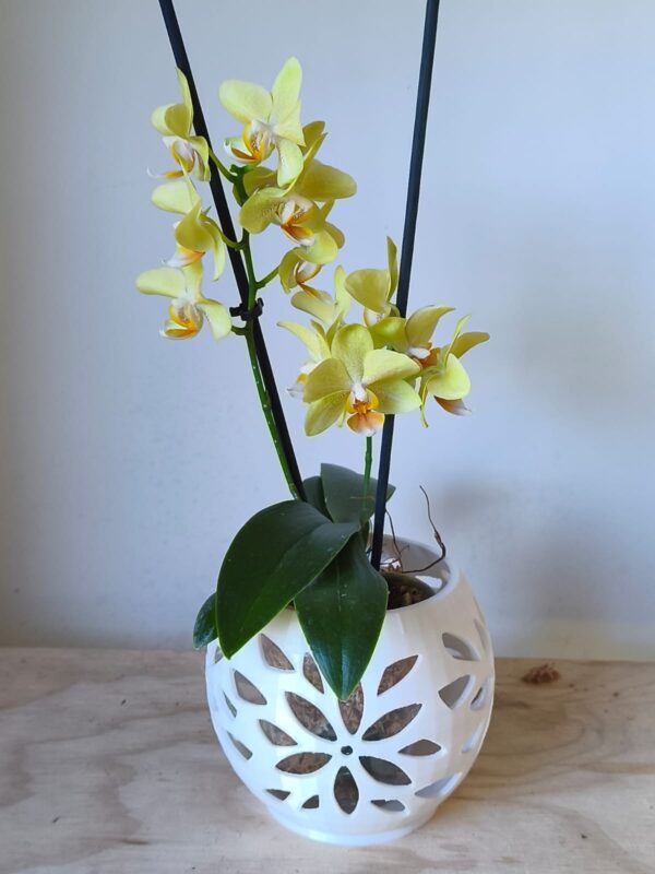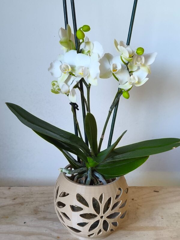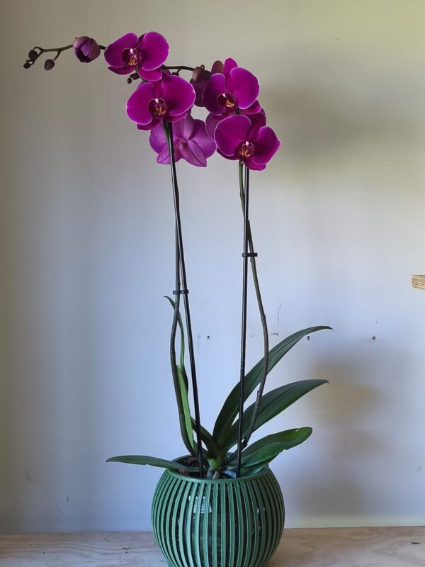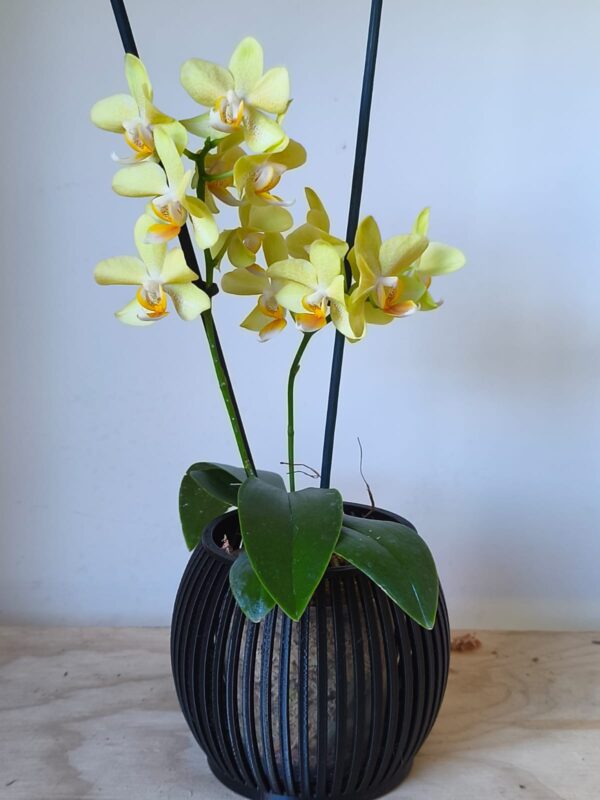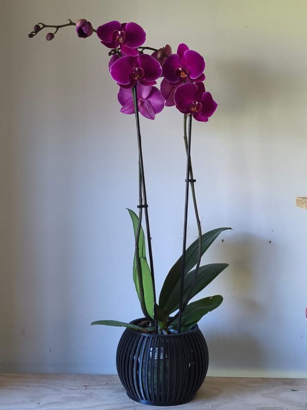 Arreglo tres orquìdeas mini en maceta greda negra mate
